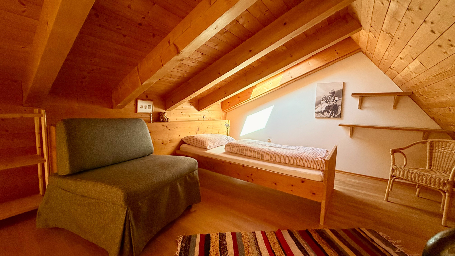 La camera a soppalco è arredata con un letto singolo, un divano letto e due comodini ed è raggiungibile attraverso una scala leggermente ripida. È popolare tra i clienti che amano il comfort di una mansarda.